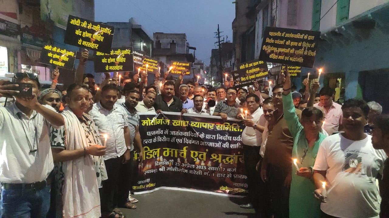 आगरा। आज शाम पांच बजे ही मोतीगंज बाजार बंद हो गया। हाथों में मोमबत्ती लिए सभी व्यापारी 22 अप्रैल को कश्मीर के पहलगाम में आतंकी हमले में मृतक लोगों को श्रद्धांजली देने के लिए एकत्रित हुए। पाकिस्तान के खिलाफ खूब नारेबाजी हुई। भारत माता के जयकारों और वंदे मातरम के साथ मोतीगंज बाजार दरेसी नम्बर एक द्वार से बेलनगंज तक आतंकी हमले के विरोध में कैंडल मार्च निकाला। कैंडल मार्च में आगरा व्यापार मण्डल के पदाधिकारी भी मौजूद रहे।