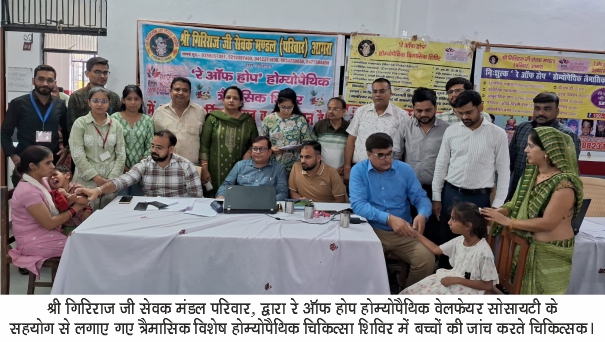 आगरा। श्री गिरिराज जी सेवक मंडल (परिवार), आगरा द्वारा रे ऑफ होप होम्योपैथिक वेलफेयर सोसायटी के सहयोग से रविवार को बल्केश्वर स्थित गणेशराम नागर सरस्वती शिशु बालिका विद्या मंदिर विद्यालय में त्रैमासिक विशेष होम्योपैथिक चिकित्सा शिविर का आयोजन किया गया। शिविर विशेष रूप से मानसिक, शारीरिक और आनुवंशिक रोगों से पीड़ित 300 से अधिक बच्चों का निःशुल्क परीक्षण व उपचार किया गया। संस्था सदस्य अजय गोयल ने बताया कि शिविर में मानसिक पक्षाघात, शारीरिक पक्षाघात, मंदबुद्धि, जन्मजात शारीरिक विकृति, भेंगापन (आंखों का तिरछापन), डी.एम.डी., आनुवंशिक विकार व ऑटिज़्म जैसी जटिल एवं जन्मजात समस्याओं से ग्रसित बच्चों का स्वास्थ्य परीक्षण 35 विशेषज्ञ चिकित्सकों की टीम ने किया।