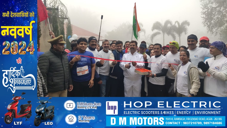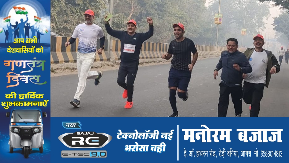 आगरा। हाथों में तिरंगा लिए कोहरे की धुंध को चीरते हुए दौड़ते सैकड़ों धावक, उत्साहवर्धन के लिए ढोल नगाड़ों का संगीत। कुछ ऐसा ही नजारा था आज खेलगांव में। जहां आगरा स्पोर्ट्स फाउंडेशन द्वारा 3 मार्च को ताजनगरी में पहली बार आयोजित होने जा रही हाफ मैराथन के 5 किमी के फर्स्ट प्रोमो का आयोजन किया गया। प्रतियोगिता के भाव से अधिक मन में कटऑफ टाइम (एक घंटा) के अन्दर दौड़ को पूरा करने की इच्छा नजर आई धावकों में। कार्यक्रम का शुभारम्भ फीता काटकर व हरी झंडी दिखाकर मुख्य अतिथि एडीशनल कमिश्नर केशव कुमार चौधरी व विशिष्ठ अतिथि एसएन मेडिकल कालेज के प्राचार्य डॉ. प्रशान्त गुप्ता ने किया।