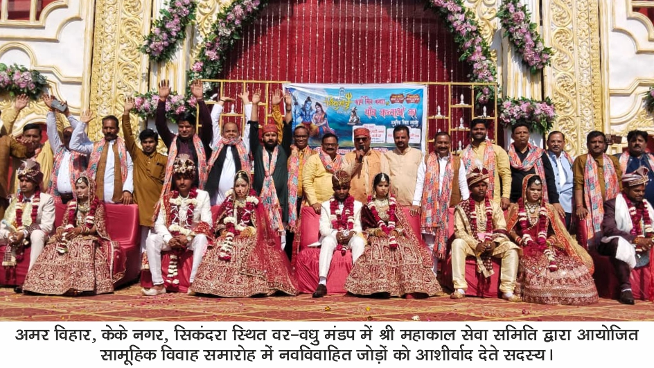 आगरा। श्री महाकाल सेवा समिति द्वारा आयोजित चार दिवसीय महाशिवरात्रि महोत्सव के अंतर्गत सोमवार को केके नगर, सिकंदरा स्थित वर-वधु मंडप में पांच कन्याओं का सामूहिक विवाह वैदिक रीति-रिवाजों के साथ श्रद्धा और गरिमा के बीच संपन्न हुआ। पूरे परिसर में वैदिक मंत्रोच्चार, शहनाई की मधुर ध्वनि और “हर-हर महादेव” के जयघोष से वातावरण भक्तिमय बना रहा।