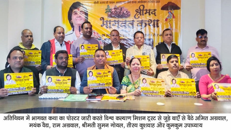 विश्व कल्याण मिशन ट्रस्ट के मैनेजिंग ट्रस्टी और आगरा के प्रमुख समाजसेवी पार्षद मुरारी लाल गोयल पेंट वालों ने शुक्रवार को वाटर वर्क्स स्थित अतिथिवन में पत्रकारों को उक्त जानकारी देते हुए जन जागरूकता की दृष्टि से इस दिव्य धार्मिक आयोजन का आकर्षक पोस्टर जारी किया। मुरारी लाल गोयल ने कहा कि 16 कलाओं के स्वामी पूर्ण अवतार भगवान श्री कृष्ण का चरित्र भौतिकवाद व तनाव में घिरे मानव मन को परम विश्रांति प्रदान करता है। प्रभु की दिव्य कथा के श्रवण से मानव जीवन श्रेष्ठ बनता है। बस इसी उद्देश्य से इस कथा का आयोजन किया जा रहा है।