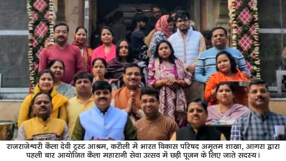 आगरा। राजराजेश्वरी कैला देवी ट्रस्ट आश्रम, करौली में भारत विकास परिषद अमृतम शाखा, आगरा द्वारा पहली बार आयोजित किए जा रहे कैला महारानी सेवा उत्सव का प्रथम दिवस सोमवार को श्रद्धा, आस्था और भक्ति के अनुपम वातावरण में संपन्न हुआ। आश्रम परिसर दिनभर “जय कैला मैया” और “मैया तेरी महिमा अपरंपार” के जयघोषों से गूंजता रहा। मेहंदी, भजन, जागरण और भक्ति गीतों के माध्यम से श्रद्धालुओं ने मां कैला मैया के प्रति अपनी आस्था और समर्पण प्रकट किया।
