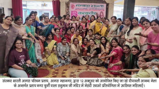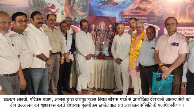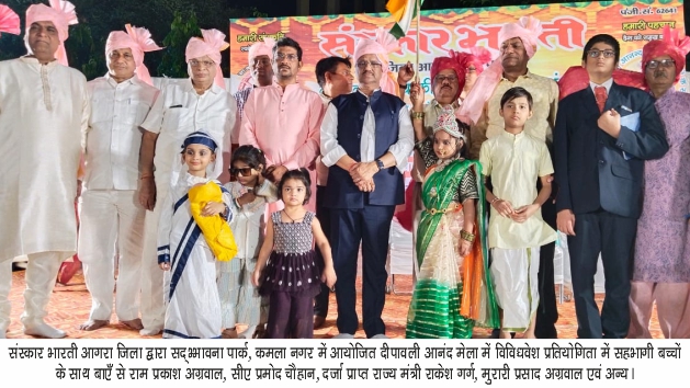 आगरा। सिर्फ मस्ती और उमंग ही नहीं संस्कारों का भी मेला लगा था। शंखनाद की प्रतियोगिता ने जहां स्वस्थ रहने के साथ अपनी परम्पराओं से जुड़े रहने का संदेश दिया वहीं स्वर्णिम भारत की थीम पर आयोजित सांस्कृतिक कार्यक्रमों ने दर्शकों को उत्साह से भर दिया। कुछ एसा ही नजारा था संस्कार भारती, पश्चिम प्रताप, आगरा द्वारा जयपुर हाउस स्थित श्रीराम पार्क में आयोजित दीपावली आनन्द मेंले में। जिसका शुभारम्भ मुख्य अतिथि केन्द्रीय पंचायती राज्य मंत्री प्रो. एसपी सिंह बघेल, विधायक पुरुषोत्तम खंडेलवाल, बांके लाल गौड़, सुभाष अग्रवाल राष्ट्रीय कोषाध्यक्ष, प्रेमचंद्र अग्रवाल सुपारी, आर्कि राजीव द्विवेदी, गौरव बंसल धूम पायल, जयरामदास होतचंदानी, इंजी गौरव जिंदल, रमेश अग्रवाल नमक वाले, घनश्याम दास अग्रवाल, डॉ ऋषि महाजन, चौधरी तपेश जैन, महेंद्र खंडेलवाल आर के मार्केटिंग, बृजेश सूतैल, नवीन उपाध्याय, सुरेश अग्रवाल जैंगारा, रवि नारंग, सी ए संजय अग्रवाल ने गणेश, लक्ष्मी और सरस्वती की तस्वीर के समक्ष दीप प्रज्ज्वलित कर किया।