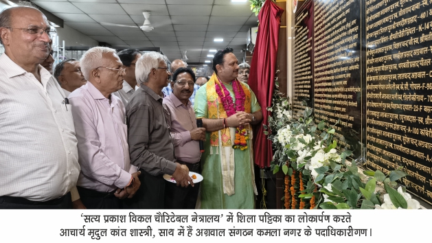 कार्यक्रम का शुभारंभ अंतरराष्ट्रीय ख्यातिप्राप्त कथावाचक आचार्य मृदुल कांत शास्त्री द्वारा शिला पट्टिका के अनावरण से हुआ। उन्होंने कहा कि पीड़ित मानवता की सेवा से बड़ा कोई धर्म नहीं। अग्रवाल संगठन स्थापित सत्य प्रकाश विकल नेत्रालय समाज में सेवा की ज्योति जला रहा है।